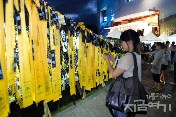 ▲시민이 근조 리본을 정성껏 달고 있다.