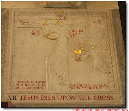 예수의 마지막 대사는 위에, 그리고 그의 피는 성작을 든 천사의 모습에서 그의 제사인 미사 전례로 온전히 옮겨진다. 그리고 그는 십자가 위에서 죽어가면서도 축복하는 손으로 우리에게 인사한다. 그의 죽음 후 지상에 남겨진 라틴어는 우리에게 조용히 말한다. 그의 죽음은 우리 때문이라는 것을......