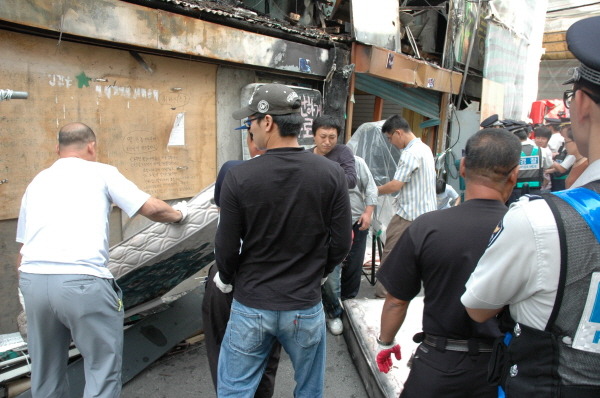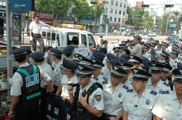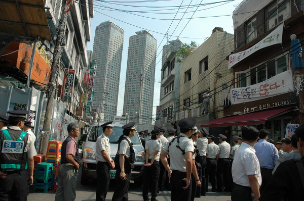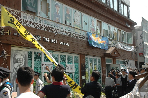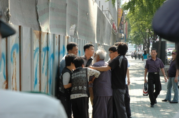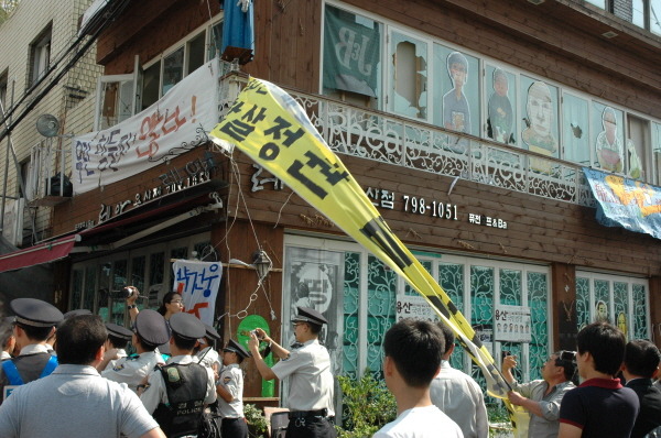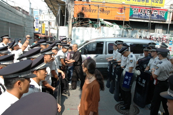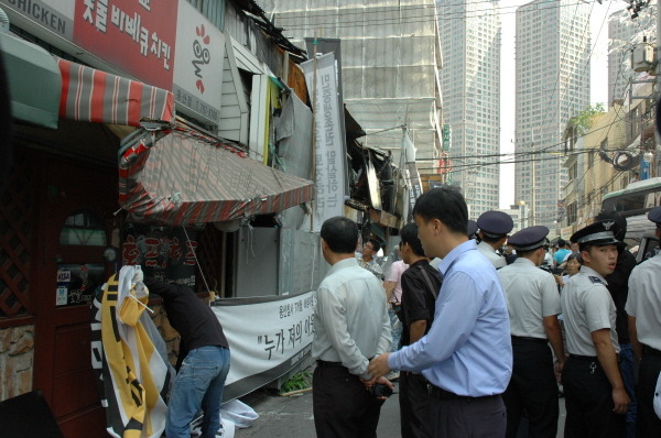 경찰은 길 입구 마다 방패로 막고 문정현 신부를 비롯해 항의하는 사람들의 출입을 막았다. 유가족을 비롯해 참사현장을 지키던 사람들이 전국촛불순회문화제와 용산참사 관련 재판정에 간 사이에 일어난 일이었다. 경찰과 용역은 사람들이 적은 틈을 노렸던 것이다.