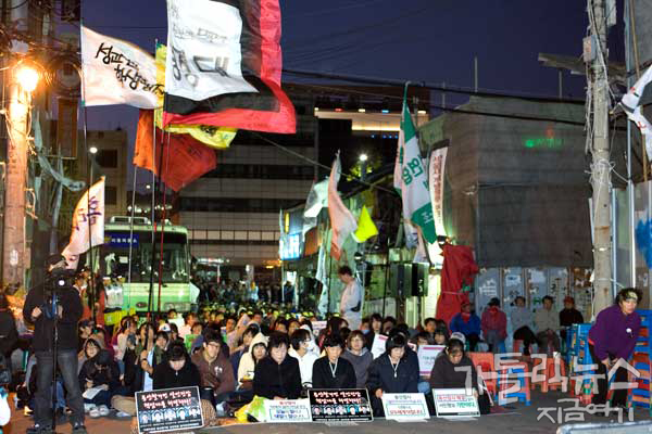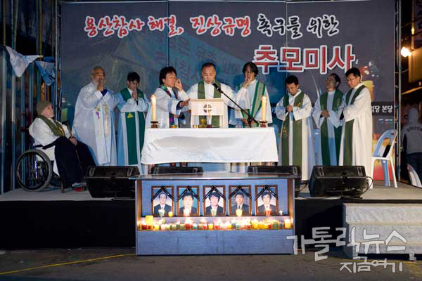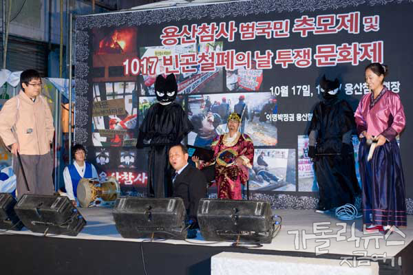 10월 17일(토)은 빈곤 퇴치의 날이었다. 광화문 광장에서는 관련된 행사들도 크게 열렸다. 진정 빈곤이 철폐되려면 실질적인 정책이 바뀌어야 한다. 지금 빈곤 때문에 울부짓는 이들에게 당장 위로를 줘야 한다. 17일 저녁 용산에서 '1017 빈곤철폐의날 투쟁 문화제'와 '용산참사 추모미사'가 열렸다. - 편집자 주 <가톨릭뉴스 지금여기 http://www.catholicnews.co.kr> ▲용산참사 현장에서 '1017 빈곤철폐의날 투쟁 문화제'가 열렸다.▲전국철거민연합 깃발이 바람에 흩날린다.▲용산국민법정에 세워진 피고인 이명박, 김석기, 오세훈 등을 염라대왕이 심판하고 있다.▲철거민, 가난한 이들에게 다시 추위가 찾아오고 있다.▲우리들에게 따뜻한 빛을 주소서.