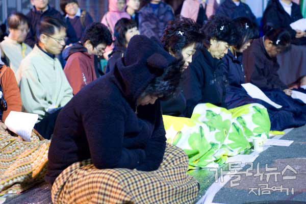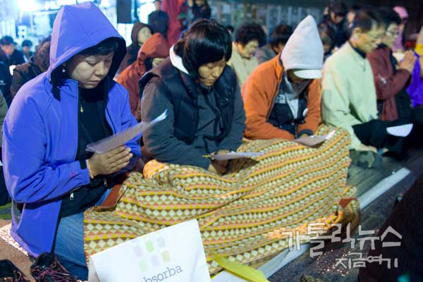 10월 17일(토)은 빈곤 퇴치의 날이었다. 광화문 광장에서는 관련된 행사들도 크게 열렸다. 진정 빈곤이 철폐되려면 실질적인 정책이 바뀌어야 한다. 지금 빈곤 때문에 울부짓는 이들에게 당장 위로를 줘야 한다. 17일 저녁 용산에서 '1017 빈곤철폐의날 투쟁 문화제'와 '용산참사 추모미사'가 열렸다. - 편집자 주 <가톨릭뉴스 지금여기 http://www.catholicnews.co.kr> ▲용산참사 현장에서 '1017 빈곤철폐의날 투쟁 문화제'가 열렸다.▲전국철거민연합 깃발이 바람에 흩날린다.▲용산국민법정에 세워진 피고인 이명박, 김석기, 오세훈 등을 염라대왕이 심판하고 있다.▲철거민, 가난한 이들에게 다시 추위가 찾아오고 있다.▲우리들에게 따뜻한 빛을 주소서. 김용길 cieloygkim@hanmail.net 다른기사 보기 저작권자 © 가톨릭뉴스 지금여기 무단전재 및 재배포 금지 당신만 안 본 뉴스 "인공지능은 도구일 뿐, 책임은 오로지 인간의 몫" 번영이라는 신기루에서 벗어나는 2026년 수도자 - 하느님 백성의 필수 구성원 아무도 미워하지 않는 어느 미등록 이주 노동자의 죽음 얼룩무늬 청춘의 흔적들 - 군대 같던 나라의 군복무 부산물 줄 세우지 않는 평등한 사회를 시노드 이행과 청년 고립... 해법은 '경청, 동반, 연속성' "인공지능은 도구일 뿐, 책임은 오로지 인간의 몫" 라이브리 댓글 작성을 위해 JavaScript를 활성화 해주세요 주요기사 제주4.3 은인, 문상길 중위 찾아 안동 까치구멍집으로 우리에게 필요한 트리아지 형이상학적인, 너무나 형이상학적인: 일체·삼위 개념의 탄생 [새책] “자연스럽다는 말”, “한번 읽어 봅시다!” 교황청 미성년자보호위원회 2024년 보고서 - 한국 천주교회 편 미 주교단, 트럼프 '무차별 대규모 추방'에 정면 반대