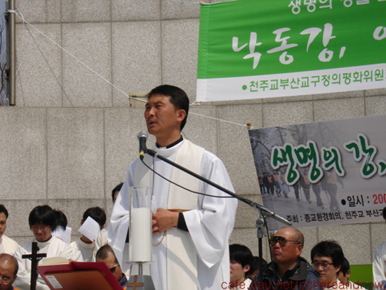 ‘생명의 강을 모시는 사람들’이 걷고 있는 순례가 50일째에 접어드는 지난 4월 1일 부산 을숙도 문화회관 앞에서 천주교의 날 행사를 열었다. 이 행사는 “낙동강, 아, 생명의 강이여”라는 주제로 천주교 부산교구 정의평화위원회가 주관하여 미사를 봉헌하였다. 이 행사에 앞서 순례단은 낙동강 하구 삼락둔치 낙동대교에서 출발하여 을숙도에 도착하였다. 이 자리에는 전국에서 모여온 불교, 개신교 목사들, 그리고 천주교정의구현전국사제단 등 사회사목을 담당하는 천주교 성직자들과 수도자들이 대거 참여하였으며, 다른 교구에서 버스를 대절하여 방문한 신자 등 150여명이 모였다.