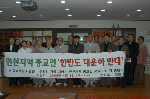 불교, 원불교, 기독교, 천주교 관계자들이 한자리에 모여 ‘한반도 대운하 저지를 위한 인천지역 종교인 대책위원회’를 구성, 공동성명을 발표하고 종교인과 시민이 대운하 반대운동에 적극 동참할 것을 호소했다. 이들 인천지역 종단 교계 대표들은 지난 3일 오전 11시 인천불교회관에서 기자회견을 열고 행동으로 보여줄 수 있는 모든 것을 동원, 운하반대에 나설 것을 분명히 했다.