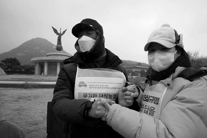 “성미선 동지가 병원으로 실려가고, 정홍형은 18킬로가 빠지고, 송경동은 어제 기자회견을 방해하는 경찰들과 싸우다 쓰러졌다. 이전 정권과 다르지 않은, 아니, 더한 노동 존중 정권. 그럼에도 김우가 웃는다. 곧 피어날 매화처럼 어쩌면 목련처럼. 단식 42일째, 날 기다리는 사람들. 또 야속한 비가 내린다.”
