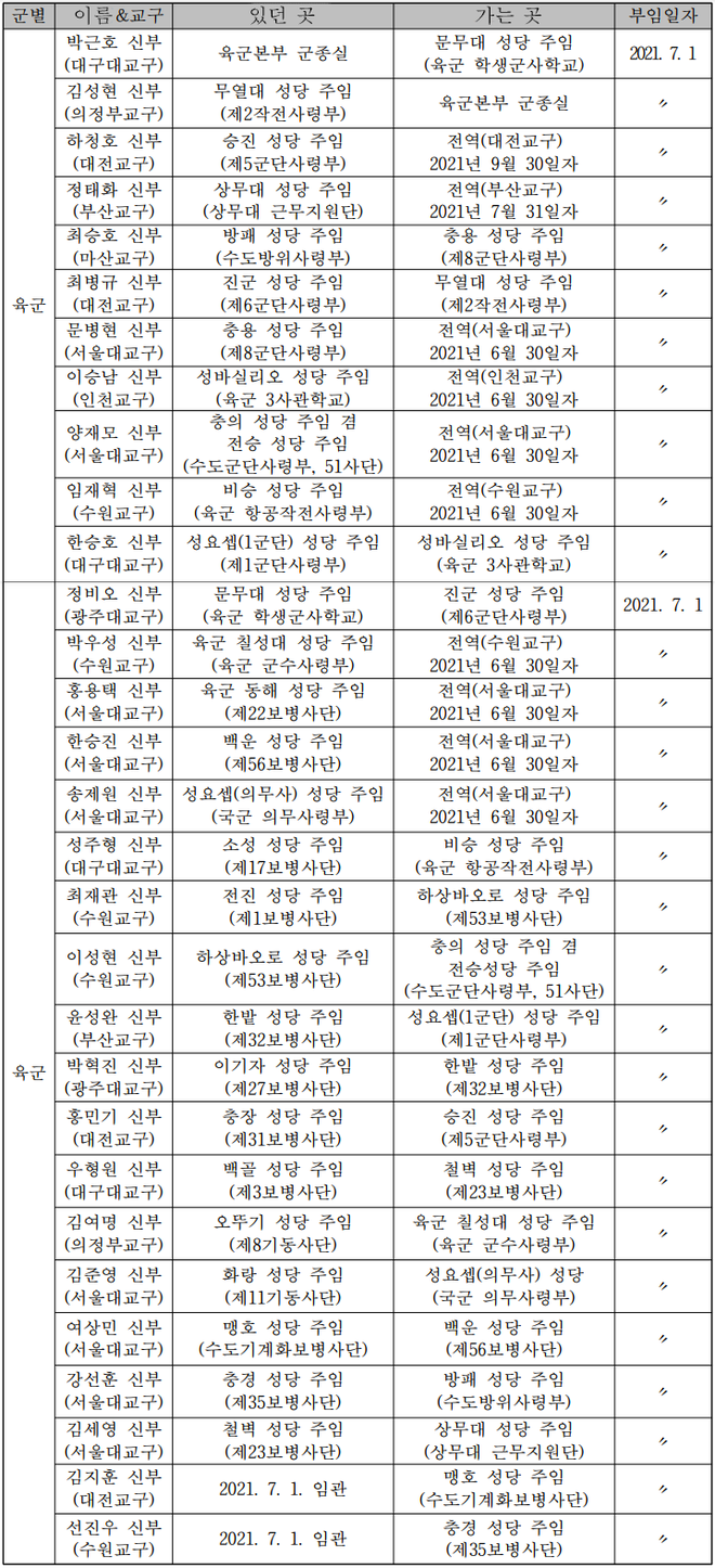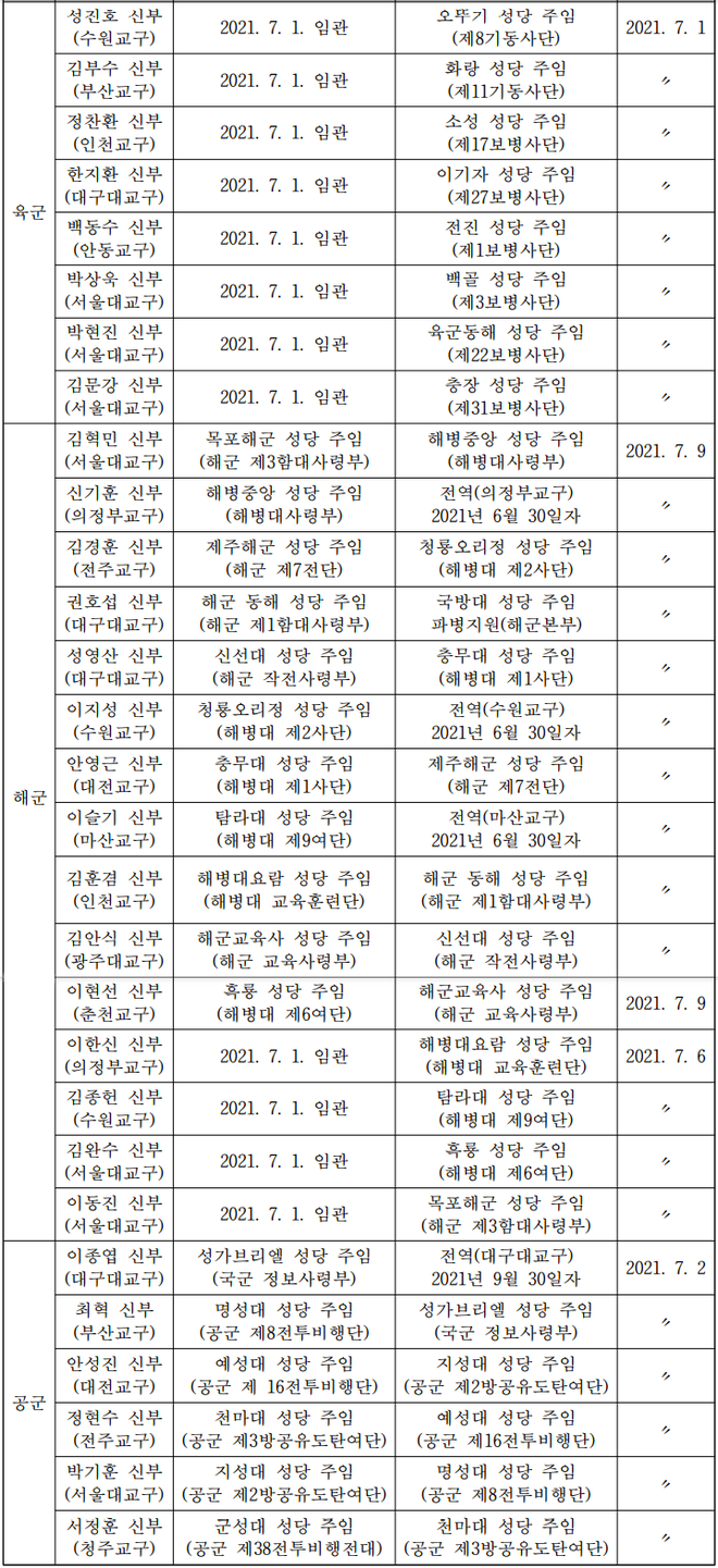 관련기사 군종교구 사제 인사(2019.07.01) [단신] 군종교구 사제 인사(2019.01.20) [단신] 군종교구 사제 인사(2018.12.21) 군종교구 사제 인사(2022.06.27) 군종교구 사제 인사(2023.06.27)