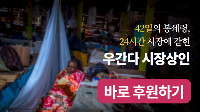 6월 18일, 우간다에서는 42일간의 봉쇄령이 다시 시작되어 수많은 사람의 생계를 위협하고 이들을 취약한 환경으로 몰고 있습니다. 여기, 3주 넘게 집으로 돌아가지 못하고 시장에서 24시간을 보내야 하는 상인들이 있습니다. 정부의 방역 지침으로, 귀가하는 순간 다시 생업으로 돌아올 수 없는 상황. 가족의 생계를 책임져야 하기에 이들은 집으로 도저히 돌아가지 못하는 것입니다. 봉쇄령이 종료되는 7월 말까지 계속 시장에 머물러야 하는데 열악한 시장의 환경은 상인들의 안전과 위생을 보장해 주지 못합니다.