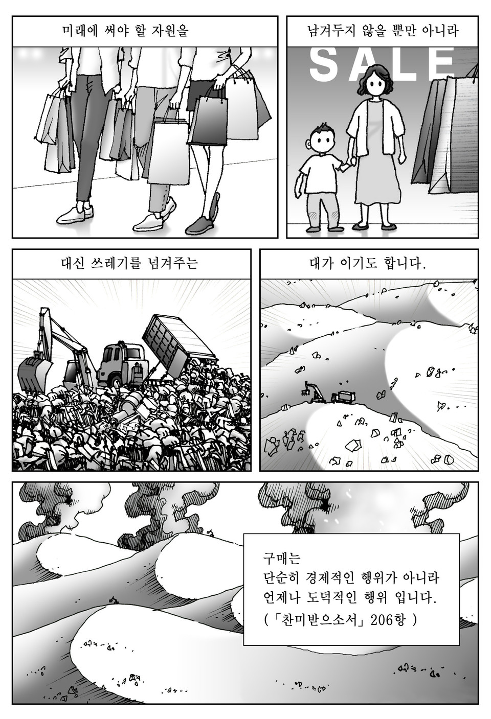 '찬미받으소서 7년 여정'을 맞아 2022년 한 해 동안 '만화로 읽는 찬미받으소서 7년 여정'을 월 1회 연재합니다. 생태위기 극복을 위한 보편교회의 가르침을 함께 나누고, 생태적 회개를 이루는 시간 되길 바랍니다. <산 위의 마을> 공동게재를 허락해 주신 박병택 씨에게 감사드립니다. -편집자