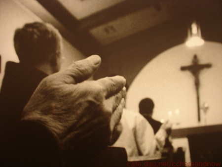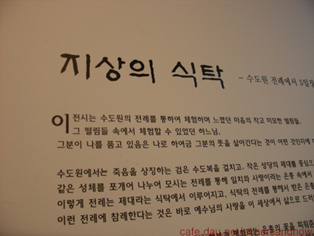이미 경향신문과 평화신문 등에 소개된 바 있었지만, 저녁무렵이라 그런지 전시장은 다소 한산한 편이었다. 수도원의 성찬례나 요즘 시골 장터가 사람들 벅적이는 인기 있는 공간이 아니고 보면, 오히려 전시장의 사진들은 저마다 적막한 가운데 관상에 젖어있는 풍광을 자아낸다. 수도원의 전례를 8년 동안 카메라에 담아 왔던 김선규 수사의 사진은 먹빛이다. 검은 수도복을 걸치고 작은 성당에 모인 수도자들이 성체를 쪼개어 나눔으로써 세상의 먹이로 오신 예수의 삶과 죽음을 기념하는 것이다. 여기서 제대란 김수사의 말마따나 “식탁에서 이루어지는 은총이며 또 다른 사람들에게 흘러갈 사랑”이다. 그래서 성찬례는 예수의 사랑을 이 세상에서 들어 올리는 거룩한 상징이 된다.