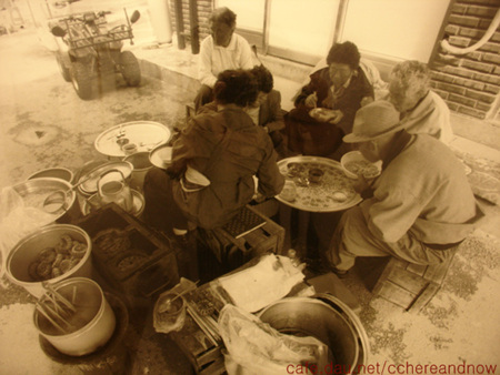 파장(罷場)하면서 땅바닥에 차려진 김치조각과 막걸리 한잔의