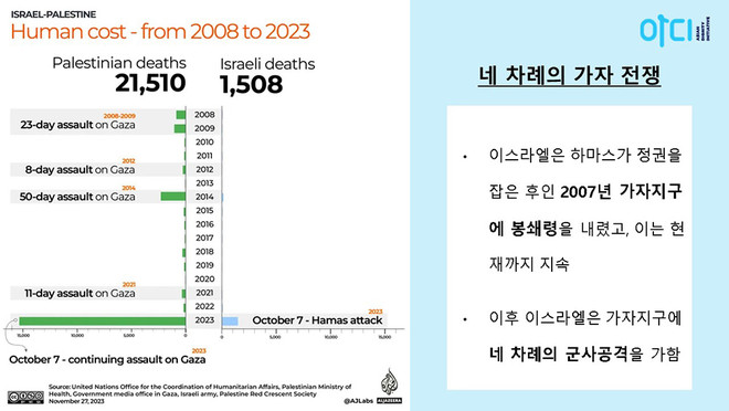 이동화 활동가는 이스라엘과 팔레스타인 분쟁에 따른 희생과 피해 규모로 “유례없는 숫자가 기록되고 있다”면서, “가자지구 인구가 230만 명이고, 한국 인구 5000만 명에 비교해 보면, 가자지구 사망자 1만 4000의 규모는 한국으로 치면 50-60만 명에 해당한다. 그만큼의 사람들이 6주만에 죽어간 것”이라고 말했다.