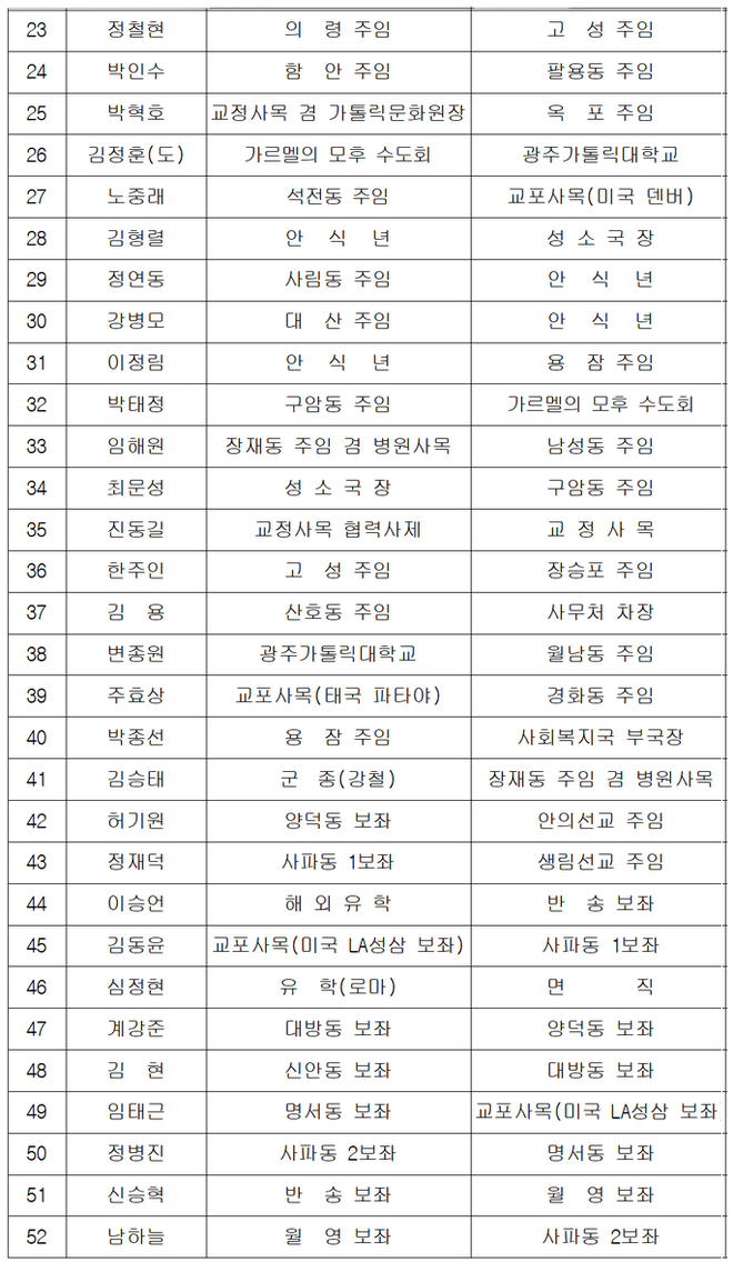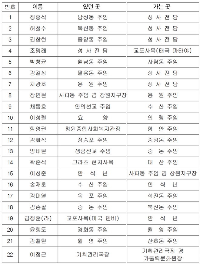 부임일 : 2024년 1월 19일(금) <가톨릭뉴스 지금여기 http://www.catholicnews.co.kr> 관련기사 마산교구 사제 인사 및 위원회 임면(2023.08.22) 마산교구 사제 인사(2022.12.30) 이성효 주교, 마산교구장 임명 마산교구 사제 인사(2025.01.03) 키워드 #마산교구 #사제인사 왕기리 기자 bene@catholicnews.co.kr 다른기사 보기 저작권자 © 가톨릭뉴스 지금여기 무단전재 및 재배포 금지 당신만 안 본 뉴스 "인공지능은 도구일 뿐, 책임은 오로지 인간의 몫" 번영이라는 신기루에서 벗어나는 2026년 수도자 - 하느님 백성의 필수 구성원 아무도 미워하지 않는 어느 미등록 이주 노동자의 죽음 얼룩무늬 청춘의 흔적들 - 군대 같던 나라의 군복무 부산물 줄 세우지 않는 평등한 사회를 시노드 이행과 청년 고립... 해법은 '경청, 동반, 연속성' "인공지능은 도구일 뿐, 책임은 오로지 인간의 몫" 라이브리 댓글 작성을 위해 JavaScript를 활성화 해주세요 주요기사 제주4.3 은인, 문상길 중위 찾아 안동 까치구멍집으로 우리에게 필요한 트리아지 형이상학적인, 너무나 형이상학적인: 일체·삼위 개념의 탄생 [새책] “자연스럽다는 말”, “한번 읽어 봅시다!” 교황청 미성년자보호위원회 2024년 보고서 - 한국 천주교회 편 미 주교단, 트럼프 '무차별 대규모 추방'에 정면 반대