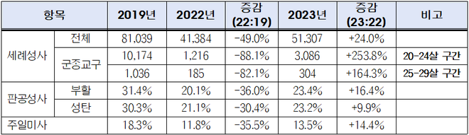 판공도 2022년 대비 2023년 부활판공은 16.4퍼센트포인트, 성탄판공은 9.9퍼센트포인트 늘어났다. 2022년에 비해 다소 회복은 되었지만 미사 참석률 증가율 수준에 머물렀다.(표 2 참조) 이 역시도 2019년 이전부터 큰 추세에서 감소세였기에 20퍼센트 초반대 정도로 회복되는 데 그칠 것으로 보인다.