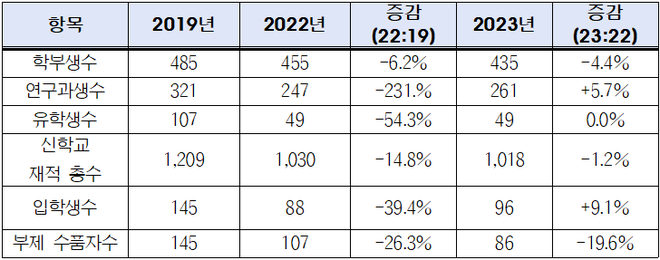 〈표 4〉 대신학생 관련 항목 변화추이(단위: 명, 퍼센트)