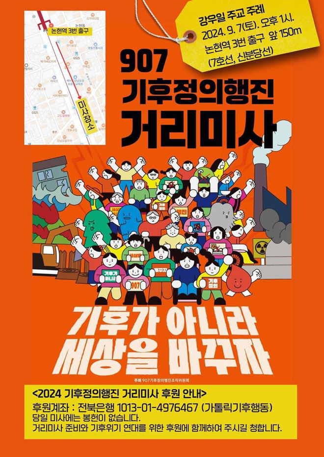 한편 천주교는 9월 7일 기후정의행진에 오후 1시 서울 강남구 논현역 3번 출구 앞에서 강우일 주교 주례로 미사를 봉헌한다.