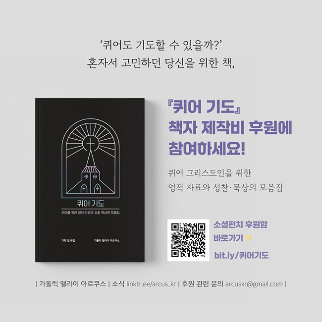 ‘가톨릭 앨라이 아르쿠스’가 예수회 소속 미국 포덤대학교 퀴어학생연합이 낸 기도와 묵상집 “기도하는 포덤”(Queer Prayer at Fordaham)을 한국어로 옮겼다. 이 책은 기금을 통해 출판, 무료 배포될 예정이다.