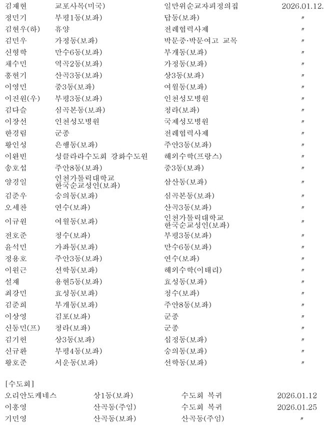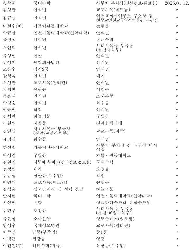 1. 천주교 인천교구 사제 인사(2025.12.26) <가톨릭뉴스 지금여기 https://www.catholicnews.co.kr> 관련기사 인천교구 사제 인사(2025.02.20) 인천교구 새사제 인사(2025.01.07) 인천교구 새사제 인사(2026.01.07) 키워드 #인천교구 #사제인사 왕기리 기자 wang@catholicnews.co.kr 다른기사 보기 저작권자 © 가톨릭뉴스 지금여기 무단전재 및 재배포 금지 당신만 안 본 뉴스 "기꺼이 가난을 살았던 신부님, 안녕히 잘 가십시오" 희망의 씨앗 “무력은 평화의 도구 아니다”…각계, 미국 파병 압박 거부 촉구 커밍아웃이라는 선물 성주간의 아픔, 그리고 사랑 인문 정신의 ‘르-네상스’, 중세 사회의 격변, 그리고 마르틴 루터 “조상의 땅은 하느님의 선물… 원주민 존엄 수호가 곧 신앙 실천” "기꺼이 가난을 살았던 신부님, 안녕히 잘 가십시오" 라이브리 댓글 작성을 위해 JavaScript를 활성화 해주세요 주요기사 "평화로는 무엇도 잃지 않으나, 전쟁으로는 모든 걸 잃는다" 우리 시대의 가족 들여다보기, 새로운 가족 상상하기 우크라이나에 살상 무기를 보내지 말라! 아시아 해방신학의 선구자, 알로이시우스 피에리스 신부 선종 성주간의 아픔, 그리고 사랑 뮤지컬 '정난주 마리아', 가장 낮은 곳에서 피어난 연대와 구원의 모성