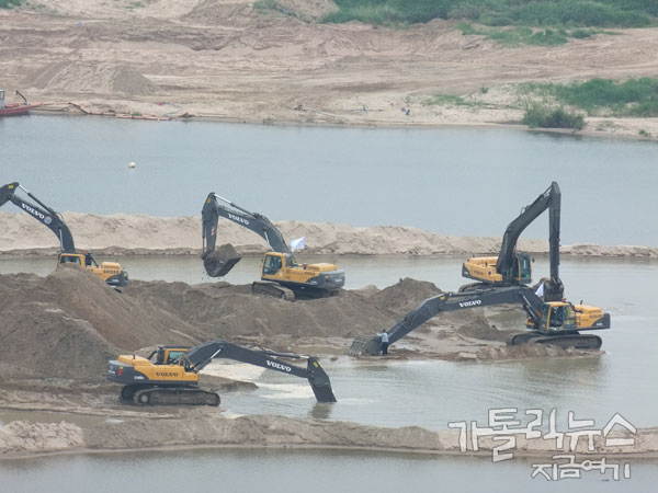 무슨 말인가 하면 월드컵기간에 움직이는 무한궤도 캐터필러를 조심하라는 말이다. 군사용 탱크나 장갑차만 무한궤도라 불리는 캐터필러를 쓰는 것은 아니다. 바로 며칠 전 한국이 남아공월드컵에서 첫 승을 따던 날, 4대강의 곳곳을 차지한 포클레인(삽차)의 캐터필러 움직임은 쉬지 않았다. 어디서 그 많은 포클레인이 왔는지 모를 일이지만 강 곳곳에서 소꿉장난이 아닌 죽기 살기로 강바닥을 파고 있었다. 6월 12일 ‘경남예술인들과 함께 걷는 낙동강순례’ 길에서 마주친 낙동강의 모습을 보고 순례참가자는 “이제는 슬픔의 눈물이 아닌 무서움의 소름이 끼친다”고 말한다. 그러나 이 무지막지한 광경은 이곳에만 해당하는 일이 아니