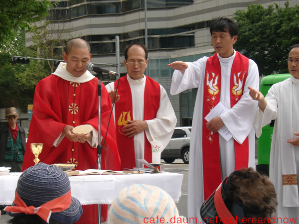 한편 지난 14일에는 서울시티타워 앞 농성장에서 가톨릭교회의 올리베따노 성베네딕도수도원과 예수회, 예수성심전교회 소속 사제들이 공동집전하는 ‘하느님의 정의와 평화가 이 땅에 이루어지기를 기원하는’ 거리 미사가 열리기도 하였다. 이날 미사는 수정만 지역에서 경남 마산시가 마을 주민들의 반대로 수정만 매립지 STX조선기자재 공장 유치가 어려워지자 관변단체를 중심한 지지 결의대회를 열기로 한 날이라서 더욱 의미심장했다. 수정 트라피스트수녀원의 장혜경(요세파) 원장수녀의 말에 따르면, “신원이 수상쩍은 명의만의 입주자들이 늘어나 조선기자재 공장 유치에 힘을 실어주는 사람이 늘고 있으나, 주로 세입자들 중심으로 마산시의 회유에 넘어가고 있으며, 수정리의 원주민들은 자신의 삶의 터전을 버릴 수 없기 때문에 대부분 유치 반대운동에 나서고 있다. 마산시가 동원한 사람들이 오늘 수정리 유치예정지에서 대대적으로 여론몰이를 하기 위해 조선소 유치 결의대회를 하겠지만 정작 주민들은 모두 여기에 올라와 있다.”고 밝혔다.