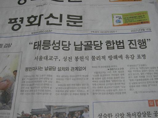 평화 신문은 이와 관련하여 1면 4단, 4면 2단, 21면 4단을 통해 사건보도와 성전봉헌보도 그리고 분석 기사를 실었으며 2면 사설에서는 입장을 표명하였다. 가톨릭신문은 이에 대해서 완전히 침묵으로 일관하고 있다. 평화신문의 단독보도에 대해 ‘물 먹은 것’이 아니라면 이것은 언론의 태도가 아니다.