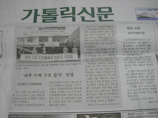 민화위가 북녘 수재민에게 구호물자를 9월 5일 전달했다. 가톨릭신문은 이를 20면 3단, 평화신문 역시 22면 3단으로 보도하였다. 어떠한 수식어에 앞서 민족공동체의 일원이 아픔을 겪고 있음에 보다 많은 단체에서 동참하는 것은 귀하고 필요한 일이다. 그러나 교회내 소식을 신문에 의존하는 독자들은 어리둥절할 수밖에 없다.