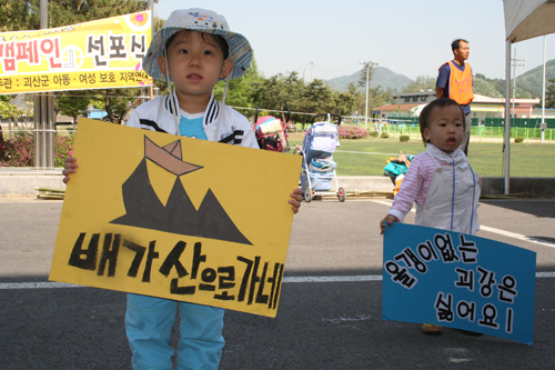 괴산 시내 천을 따라 괴산청소년문화관에 들어섰다. 어린이날 행사 중인 어린이와 지역주민들이 기립박수로 환영해 주었다. 아장아장 걸어 다니는 대운하의 주인공 아이의 손에 피켓이 들려 있다. ‘누구를 위한 운하인가’ 묻지 않을 수 없었다. 어른들의 탐욕과 무지가 떠올라 부끄러웠다.