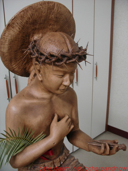 “먼저 안나의 집(실버요양원)을 지을 때는 예수님 상을 웃는 상으로 해 봤어요. 십자가의 고통에 찡그리신 예수님을 이제는 좀 웃게 해 드리자는 마음이었지요. 다 이루셨다고 하신 예수님이 한도 미련도 없으실 예수님이신데 그런 예수님이 언제까지 극심한 고통에 찡그린 그 표정으로 가시관의 고통만 맛보아야 하느냐 그 생각이었지요 뭐. 더구나 무료 요양원에 모실 할아버지 할머니들은 이미 세상을 거의 다 사신 분들이시고 대부분이 파란만장한 삶을 살아오신 데다 일반인들이 탐탁히 여기지 않는 무료 요양원에 오시니 그 심정이 오죽하시겠어? 그런 어르신들에게 찡그린 예수님만 보여드릴 게 아니라 기쁨으로 하늘나라로 부활승천하시는 환희의 형상으로 예수님의 표정을 보여드려서 기쁨으로 하늘나라를 바라보시게끔 하고 싶었어요.”