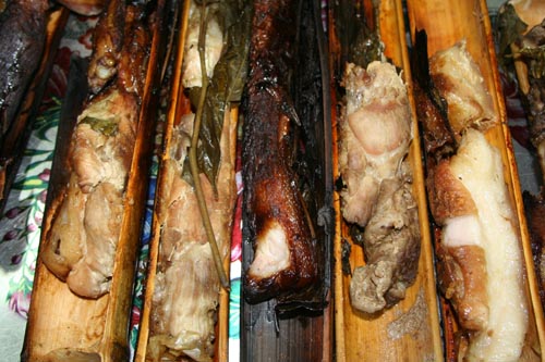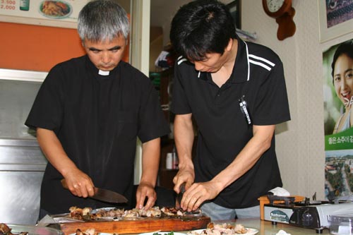 13일 오전 10시부터 교구청에서 사제 연수가 있었다. 첫 사랑과 같은 첫 본당 수류성당 신자들이 뒷마당에서 대나무 돼지구이를 정성껏 준비하고 있었다. 큰 대나무를 반으로 자르고 그 속에 돼지고기를 넣고 소금을 뿌리고 오가피잎으로 덮고 대나무를 다시 조립해서 철사로 묶는 것이었다. 그리고 호일에 싸서 장작 위에 놓고 고기를 구었다. 기름이 짝 빠진 연한 고기는 입에서 살살 녹았다. 여럿이 함께 먹으니 그야말로 꿀맛이었다.