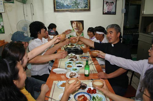꿀맛 같은 대통삼겹살 구이를 먹이고 싶은 마음에 염치불구하고 고기를 싸 달라고 부탁했다. 10통 정도를 챙겨서 자원봉사자들이 자주 식사를 하는 식당으로 갔다. 촛불문화제 끝나고 자원봉사자들과 함께 먹기 위해 대통구이를 맡겨놓았다. 그리고 저녁미사를 드리고 8시쯤 촛불문화제에 참여하기 위해 오거리로 갔다.