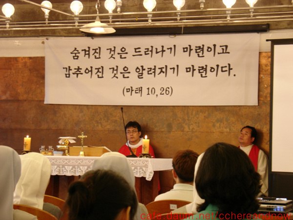 이날 미사강론에서 김정대(프란치스코, 예수회)신부는 “얼마전 노동자들이 부당해고 되어 1,000일 이상 싸우고 있는 기륭전자에 면담요청서를 전달하려고 들어간 적이 있었다”면서 구사대 중에 어떤 이는 정말로 악질적이고 폭력적으로 행동하는 이도 있었다고 했다. 그들 중 하나가 김신부와 함께 간 스님에게 “중이 염불은 안 하고 여긴 왜 왔냐?”고 하자, 그 스님 말이 “여기가 바로 내가 염불하는 자리여” 하였단다. 김신부는 복음서에 나오는 백인대장이 권력을 자신의 소유로 여기지 않았듯이 대통령도 마찬가지인데, 이명박 대통령은 권력을 제 소유로 착각하고 있다고 말했다. “그는 반복음적으로 강대국의 노예, 권력의 노예가 되어 힘없는 사람들의 요구를 묵살하고 있다.”는 것이다. 세계 어느 나라도 우리나라와 같이 50일간 촛불집회가 이어진다면 촛불집회의 요구를 무시할 나라가 없다는 것이다.
