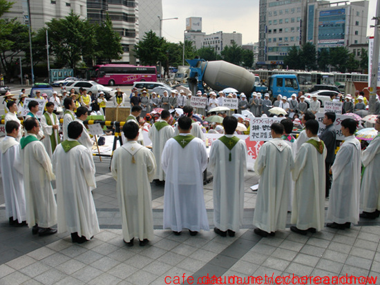 이날 미사는 이상원 신부(마산교구 정의구현사제단 대표)의 주례로 사제들과 수도자들이 주민들을 가운데 두고 울타리를 치고 보호하는 듯한 풍경을 자아내는 가운데 봉헌되었다. 강론을 맡은 백남해 신부는 “요즘은 S자만 보아도 짜증이 난다”고 하면서 “교회가 지역문제에 관심을 갖는 이유는 교회의 운명이 달려 있기 때문”이라고 말했다. 주님의 기도에서 보듯이 “하느님께서 당신의 나라를 하늘에 세우지 않고 이 땅에 세우려 했듯이, 가장 가까운 형제들의 손을 잡고 기도해야 한다”고 하였다. 또한 수정 성모 트라피스트 수녀들이 오랫동안 닫혀 있던 수녀원 문을 열고 나와서 치열한 기도를 하는 것도 같은 이유라고 설명하면서, “그래서 우리 신부들도 일당도 주지 않는데 이렇게 서울까지 와서 함께 하는 것”이라 했다. 한편 백신부는 세상의 소금이어야 할 교회가 짠맛을 잃어버리면 길거리에 버려질 텐데, 그렇게 버려지지 않으려고 우리 교회는 세상의 가난하고 약한 이들과 함께 하는 것이며, 이게 교회가 살아남는 길이라고 말했다.