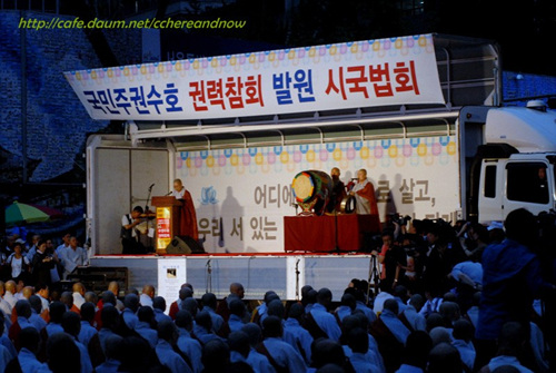 지난 7일 종교인들에 대한 형사처벌까지 고려하겠다는 서울경찰청의 발표가 있는 지 하루만인 오늘(7월 8일) 조계종단의 시국법회 추진위원회에서 긴급성명을 발표하여 앞으로 5년 동안 정부의 핍박을 받을 각오로 문제해결이 될 때까지 시국법회를 계속할 것을 밝혔다. 시국법회 추진위원회의 공동추진위원장은 수경(화계사주지/불교환경연대), 명진(강남 봉은사주지), 효림(실천불교공동의장), 정념(월정사주지/승가대총동창회장), 선묵(도선사주지/불교신문 사장), 지홍(잠실 불광사주지), 계호(진관사 주지/보우승가회 사무총장), 박광서 교수(종교자유연구원 대표) 등이며, 불교의 제 단체를 망라하고 있다.