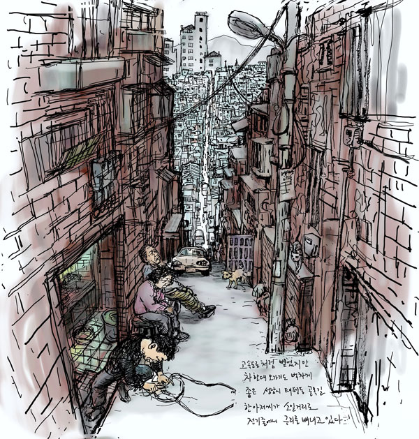 ▲ 고속도로처럼 뻗었지만 차 한 대 오가기도 벅차게 좁은 성남시 태평동 골목길. 한 아저씨가 소일거리로 전기줄에서 구리를 빼내고 있다. (그림/최호철)