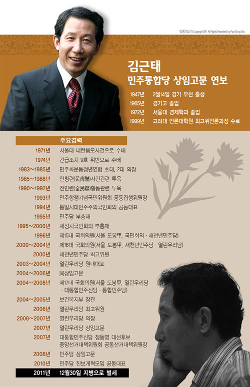 그것은 목숨을 건 결단이었습니다. 실제로 그 결성으로 김근태 님은 안기부에 체포되어 남영동 대공분실에서 그해 9월 전기고문을 여러차례 받았습니다. 배후를 지목하라는 강요로 더 큰 고통을 받았습니다. 그때 우리 모두는 그가 죽을 것이라고 생각했습니다. 몇 년 후, 그는 그 모든 고통을 이겨내고 군부 잔재를 몰아내는데 앞장섰습니다. 그는 젊은 시절의 꿈을 온 몸으로 실천한 증언자였습니다.