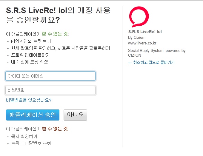 ▲ 위와 같이 트위터에 애플리케이션 승인을 요청하는 페이지가 나온다. 트위터 계정 정보를 입력하고 ‘애플리케이션 승인’을 클릭한다.
