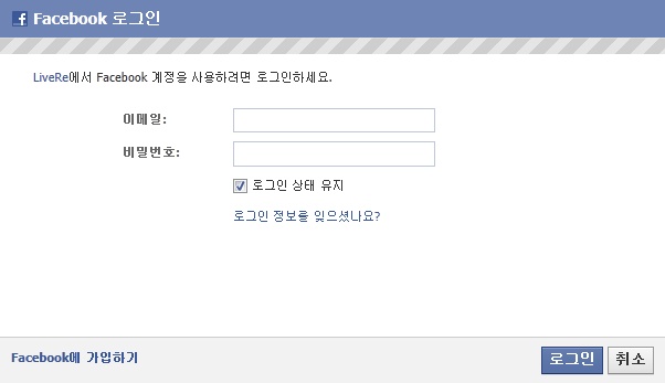 ▲ 위와 같이 페이스북 계정에 로그인하는 페이지가 나온다. (승인을 요청하는 페이지가 나올 경우, 앞서 트위터에서 애플리케이션 승인을 하는 방법과 같이 승인한다.) 페이스북 계정 정보를 입력하고 ‘로그인’을 클릭한다.