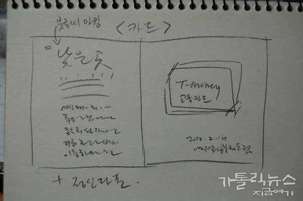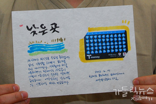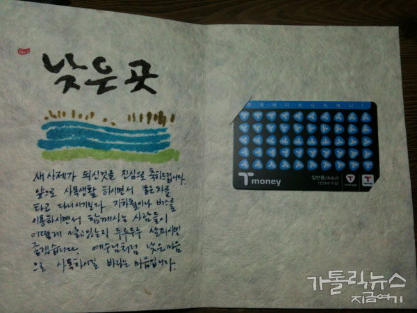 책이나 성물같은건 차고 넘칠만큼 가지고 계실거고, 비싼 선물도 많이 받으셨을테니 뭔가 작지만 재미있고 의미있는 선물 없을까? 그래서 고민끝에 결정한 것은 <교통카드>입니다. 본당에 신부님으로 지내시면서 좋은 차 타고 사람들 사는 곳을 휙휙 지나치지 마시고, 지하철과 버스같은 대중교통을 이용하시면서 사람들 사는 모습을 두루 살피시면 좋겠다는 바램을 담았습니다. 공동체의 오프(OFF)운동 중에 '승용차 오프'운동이 있기도 하구요.