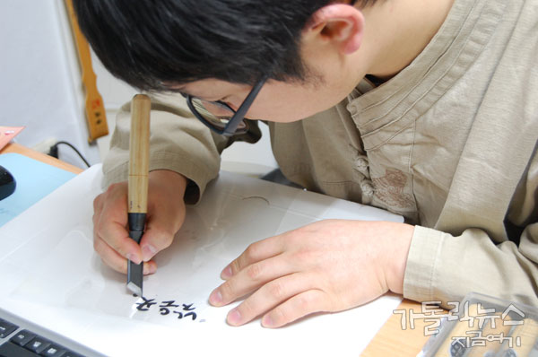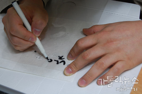 제가 붓글씨로 척척 써 넣으면 좋겠지만, 불가능하므로 서예가님의 작품중 어울릴만한 것으로 베끼기로 합니다. 일단 OHP필름에 적당한 크기로 인쇄를 한 후 칼로 글씨를 파냅니다.
