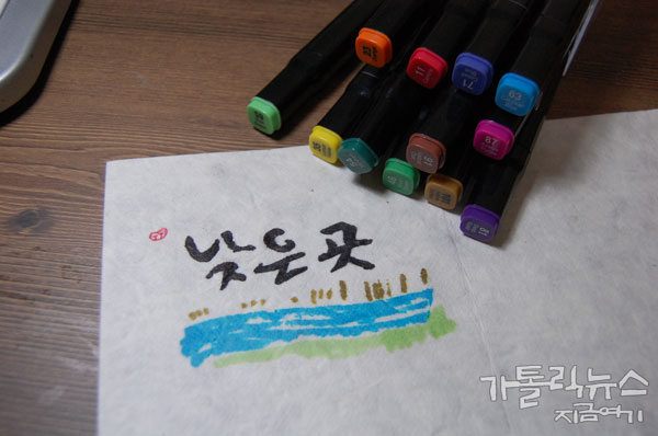 나름 글씨가 멋지게 나왔네요. 그럼 글씨 아래에 살짝 그림을 넣습니다. 요리나 카드나 색이 있어야 살지요. 글씨가 '낮은 곳'이니 언제나 아래로 흐르는 물을 그려보았습니다. 마카펜으로 쓱쓱 선을 그어주면 됩니다. 대충 그어도 뭔가 있어 보입니다. 쫄지 마세요. 파란색이니 물인줄만 알면 됩니다.