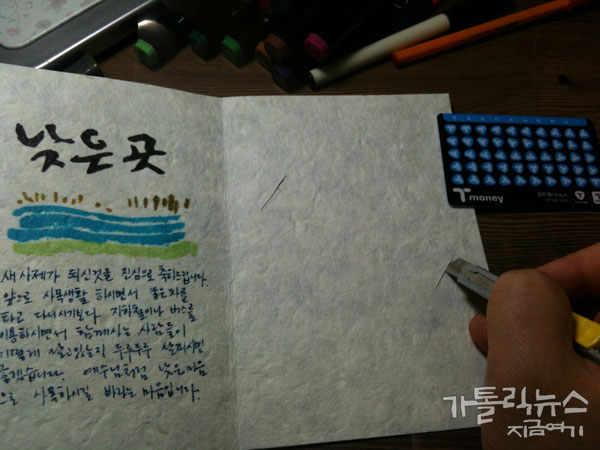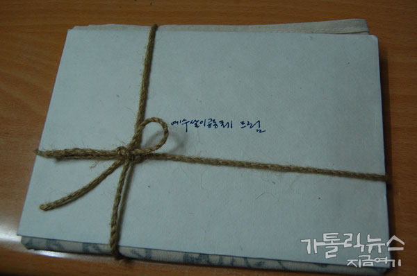 첫 번째 선물 이야기는 바로 지난 금요일, 제가 일하는 예수살이공동체의 금요미사에 첫미사를 와주신 새신부님들께 드리는 카드와 선물입니다. 거창한 것은 아니지만 이제 막 사목을 시작하시는 신부님들께 예수살이의 정신이 담긴 작은 선물을 하고 싶었습니다.