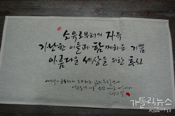 예수살이공동체에선 새사제에게 공동체 정신이 담긴 다포를 선물하곤 합니다. 카드만 달랑 주기도 뭔가 섭섭하구요. 자유, 기쁨, 투신! 세 가지 정신으로 산 다면 그 만큼 예수님께 가까워 질거라고 믿습니다.