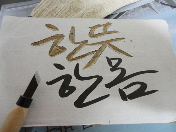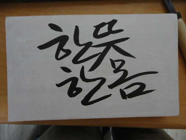 먼저 붓으로 '한 뜻 한 몸'을 이렇게 저렇게 써봅니다. 붓글씨를 못해도 상관없습니다. 그냥 볼펜으로 쓰듯이 쓰면 됩니다. 그리고 잘 쓰나 못 쓰나 자기 글씨를 쓰는 것이 더 의미 있거든요. (나중에 파내면 다 멋있어 보입니다) 붓으로 쓰는 이유는 글씨가 '선'보다 '면'이 되는 것이 좋기 때문이거든요. 보기에도 그렇고 글씨를 파낼 때도 편하지요. 굳이 생각한다면 글씨 전체가 균형에 맞도록 쓰면 좋다는 정도! 쓴 것들 여러 개중 제일 마음에 드는 하나를 고릅니다.