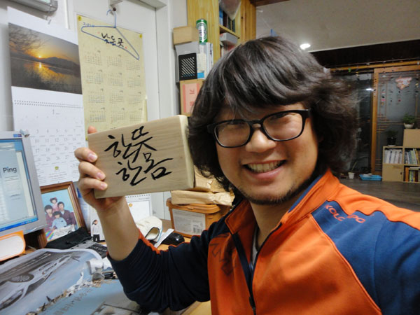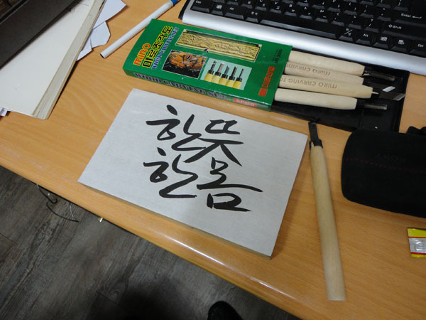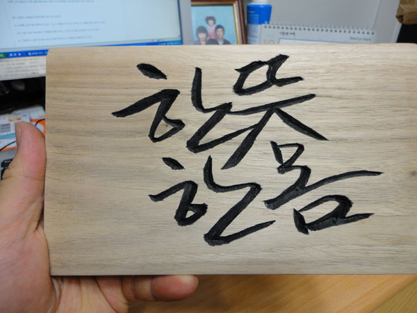 사실 선물을 사기 위해 쇼핑하는 일은 제게 너무 힘든 일입니다. 주변에 있는 물건들로 하나밖에 없는 소박한 물건을 만드는 일이 좋거든요. 결혼하는 후배부부에게 어떤 선물을 해주나 고민하다가 작은 나무판에 좋은 글귀를 새겨주기로 마음 먹었습니다. 부부를 위한 좋은 글귀를 궁리한 끝에 '부부는 일심동체'라는 말에서 힌트를 얻어 '한 뜻 한 몸'으로 정했습니다. 사실 글씨를 파내는 작업이라서 내용이 길면 힘들거든요.