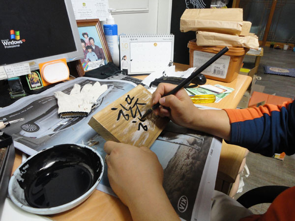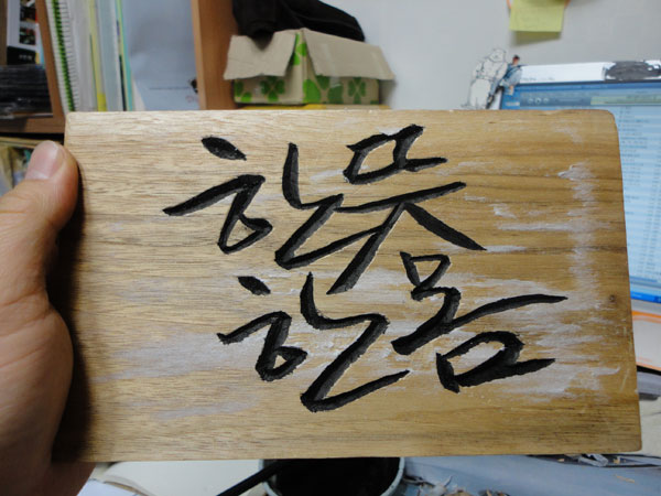 다 파낸 글씨 안에 먹칠을 합니다. 역시 먹이라야 나무에 쓴 글씨가 폼도 나는데다 먹은 가장 완전한 재료중 하나입니다. 변하지 않고 가장 오래가더든요. 먹칠을 할 때는 나무의 결을 따라 먹이 번지지 않도록 먹물을 너무 많이 묻히면 안됩니다.