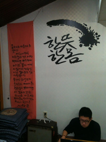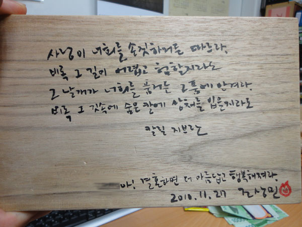 뒷면에 축하 메시지를 씁니다. 칼릴 지브란의 '사랑에 대하여'중 멋진 구절을 베껴 넣고 아래에 싸인! 붓으로 쓰는 장점 중 하나는 대충 써도 왠지 멋져보인다는 것! ^^