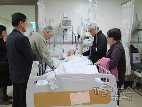 이어 두봉 주교가 “정호경 신부님이 지금 병원 중환자실에 있는데, 오늘내일 하세요.” 이 말이 떨어지기가 무섭게 장내가 숙연해졌다. 벌써 눈가에 물기가 고이는 사람들도 있었다. 돌아가는 일정에 포함되었던 천혜의 자연림과 유명한 산사 방문을 취소하고 점심식사 후에 곧장 안동의료원으로 병문안을 가기로 했다. ‘중환자실이라 우리 모두 들어갈 수도 없는데...’ 라는 말들이 있었지만 중환자실에 들어가지 못하더라도 그 앞에서 기도할 수 있으니 일단 가보자고 했다.