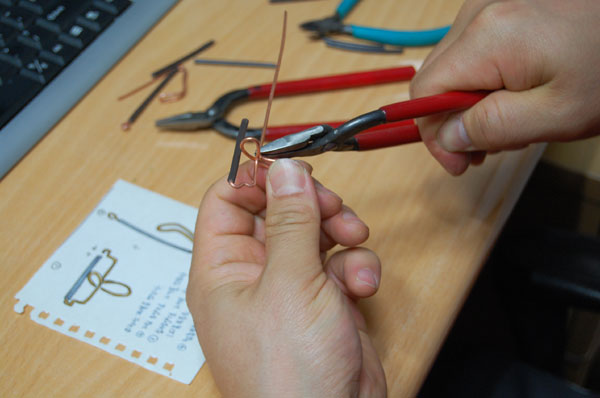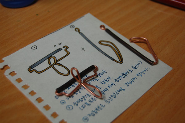 십자가 만들기의 가장 어려운 부분입니다. 전선을 짧게 여러번 구부려야 해서 간격 맞추기 등이 쉽지 않더라구요. 미리 스케치해놓은 그림을 보며 조심스럽게 작업합니다. 전선을 구부리는 공구로 처음엔 전기작업때 쓰는 '롱노즈'를 썼었는데, 이 공구는 이빨이 있어 십자가에 흠집을 많이 내더라구요. 아는 분이 보시고 악세사리 등을 만들때 쓰는 이빨 없는 공구를 가져다 주셔서 요긴하게 쓰고 있습니다. 공구 이름은 잘 모르겠네요. 덕분에 요즘 만든 십자가의 예수님은 상처가 덜하시답니다.