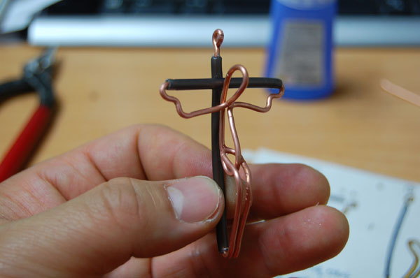 이제 십자가의 세로 기둥과 상체 가로기둥을 합칠 차례입니다. 먼저 예수님 상체를 하체에 끼워 십자고상을 완성하고, 둥근 전선끼리 붙여야 하니 접합 부분을 칼로 살짝 파내줍니다. 이때 한쪽이 삐뚤어지지 않도록 주의하셔야 해요. 안 그러면 굉장히 불량스런 포즈의 십자가가 되거든요. 파낸 부분과 상하체 접합 부분에 순간접착제를 바르고 후~ 후~ 불며 고정되기를 기다립니다. 금방 움직이면 애써 붙인 부분이 틀어지니 얼추 고정이 되었다 싶으면 손이 잘 안닿는 곳에서 몇시간은 두어야 안심!