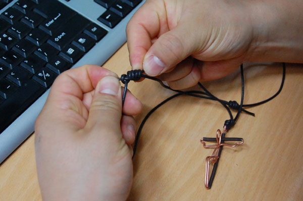 십자가 위에 목걸이줄을 연결하고 길이 조절을 할 수 있도록 매듭을 만들어 줍니다. 사람들마다 원하는 길이가 달라서 요즘 목걸이들은 이렇게들 많이 나오죠?