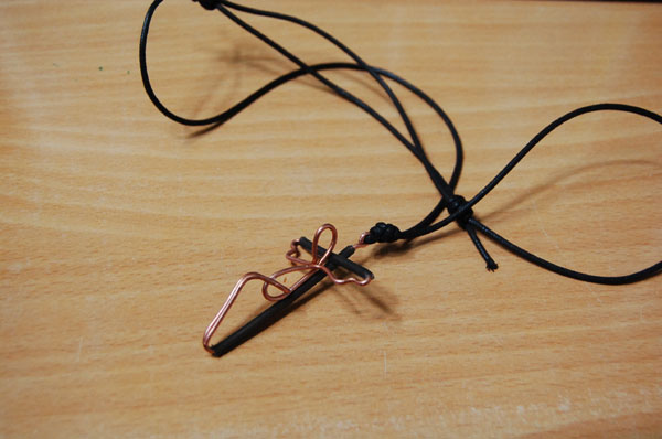 먼저 십자가의 세로 기둥과 예수님의 하체를 만듭니다. 전선을 적당한 길이로 잘라 양쪽 피복을 벗겨냅니다. 이따 전선에 흠집이 심하게 나지 않도록 주의해 주세요. 나중에 목걸이 줄을 연결할 수 있도록 윗쪽은 동그랗게 말고, 아랫쪽은 길게 접어 구부려 다리 모양을 만들어 줍니다. 개인적으로는 약간 굵은 검은색 전선을 좋아합니다. 피복을 벗겨냈을때 구리색과 확연히 대비가 되어 예쁘거든요. 취향에 따라 다양한 색의 전선으로 만들어보셔도 좋겠죠?