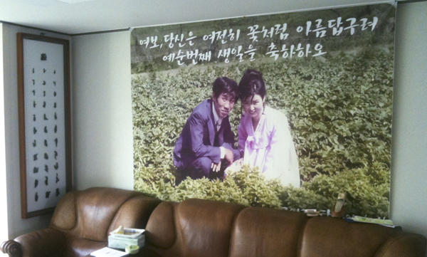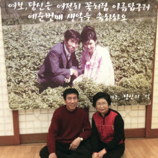 요즘 회갑이야 가까운 가족들과 식사 한 끼 하는 자리입니다만, 그래도 분위기는 살려야겠지요? 거창한 장식보다 가장 아름다웠던 약혼식 때의 어머님 사진을 배경으로 플래카드를 만들어 보았습니다. 부모님의 앨범을 몰래 뒤적여 가장 예쁜 약혼 사진을 찾아냅니다. 그리고 어머니가 가장 듣고 싶은 말을 적어 넣고 현수막 가게에 맡기면 되는 간단한 작업입니다. 물론 깜짝 선물이기에 미리 식당에 가서 준비해 놓고 부모님을 오시도록 해야겠지요?